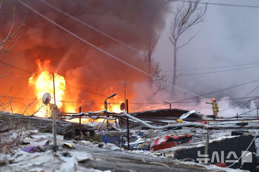 [서울=뉴시스] 최진석 기자 = 16일 화재가 발생한 서울 개포동 구룡마을에서 소방대원들이 진화작업을 하고 있다. 2026.01.16. myjs@newsis.com |