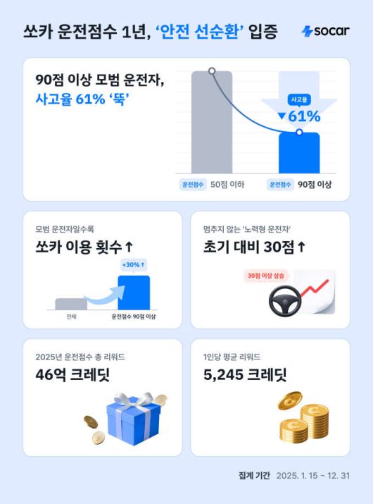 16일 쏘카는 운전점수 서비스 론칭 1주년을 맞아 지난 1년간(2025년 1월 15일~12월 31일) 이용 데이터를 분석한 결과를 공개했다.