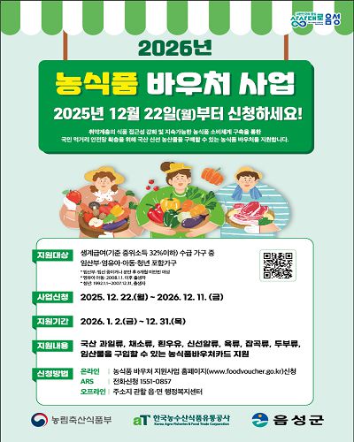 (음성=국제뉴스) 이재기 기자 = 충북 음성군은 취약계층이 신선 농산물을 구매할 수 있는 카드를 지원하는 2026년 농식품 바우처사업 신청을 받는다고 밝혔다.