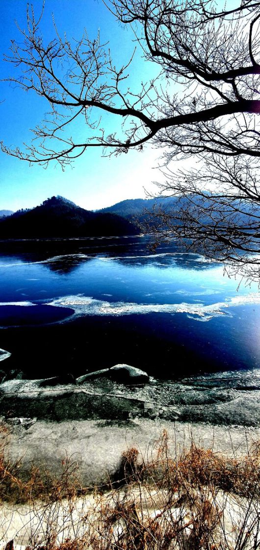 강추위가 만들어낸 고요는 모든 것을 단순하게 만들고, 얼어붙은 수면은 거대한 거울이 되어 하늘을 온전히 담아낸다. 짙고 맑은 푸른빛이 강 위에 번져, 마치 하늘과 물이 하나로 이어진 듯하다.