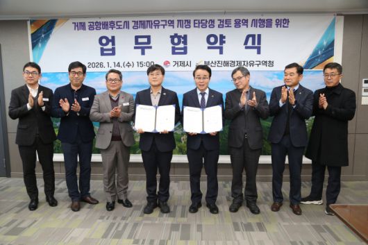 부산진해경제자유구역청(청장 박성호)은 14일 거제시청에서 거제시와 '거제 공항배후도시 경제자유구역 지정 타당성 검토 용역' 추진을 위한 업무협약을 체결했다.