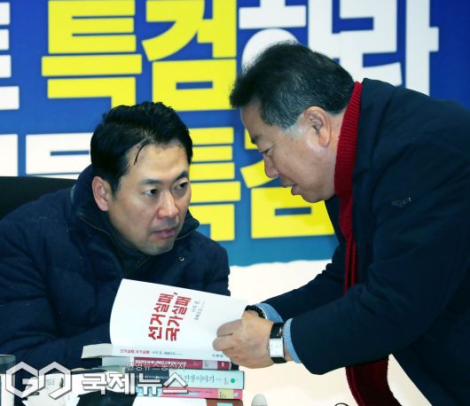 (서울=국제뉴스) '민주당의 공천 뇌물·통일교 게이트 특검 수용' 촉구 단식농성 중인 장동혁 국민의힘 대표가 16일 오전 서울 여의도 국회 로텐더홀에서 농성 중 책을 살펴보고 있다./사진=이용우 기자
