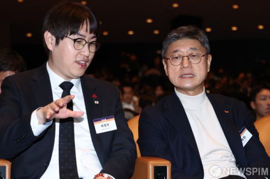 [서울=뉴스핌] 최지환 기자 = 하정우 AI미래기획수석비서관, 정재헌 SK텔레콤 대표가 30일 오후 서울 강남구 코엑스에서 열린 '독자 AI 파운데이션 모델' 프로젝트 1차 발표회에서 대화를 나누고 있다. 2025.12.30 choipix16@newspim.com |
