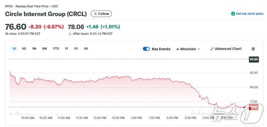 15일(현지 시각) 뉴욕증시에서 서클은 9.67% 폭락한 76.60달러를 기록했다.