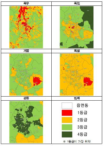 또 지역별 기후 특성과 토지이용 특성에 대한 종합적인 분석을 통해 현재와 미래의 취약성 등급안을 도출하고, 국토연구원의 검증을 거쳐 집계구별 재해 등급(Ⅰ∼Ⅳ)을 확정했다.