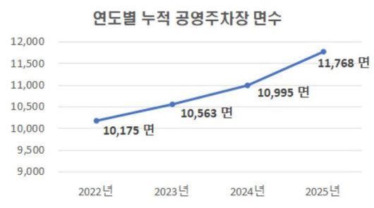 연도별 누적 공영주차장 조성 현황은 2022년 1만175면, 2023년 1만563면, 2024년 1만995면, 2025년 1만1768면으로 꾸준히 증가하고 있다.