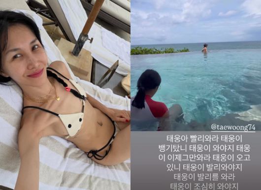 윤혜진은 15일 자신의 계정에 "태웅아 빨리 와라. 비행기 탔나. 태웅이 와야지. 이제 그만 와라. 태웅이 오고 있니. 발리 와야지. 태웅이 조심히 와야지. 태웅아 발리니"라는 글과 함께 영상을 게재했다.