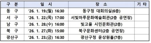 자치구별 순회 형식으로 진행되는 합동공청회는 ▲19일 동구(동구청 대회의실) ▲22일 서구(서빛마루문화예술회관) ▲23일 광산구(광산구청 윤상원홀) ▲27일 북구(북구문화센터) ▲28일 남구(빛고을시민문화관) 등 자치구별로 각 1회씩 총 5회 개최된다.