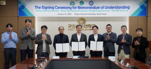 국립목포대학교가 지난 15일 본관 2층 총장실에서 대만 해상풍력 전문 교육기관 TIWTC(Taiwan International Windpower Training Corporation Ltd) 및 글로벌 인증기관 티유브이슈드 코리아와 '해상풍력 전문인력 양성'을 위한 협약을 체결했다고 16일 밝혔다.