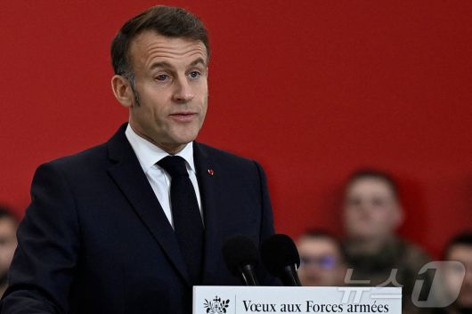 (이스트르 로이터=뉴스1) 이창규 기자 = 에마뉘엘 마크롱 프랑스 대통령이 15일(현지시간) 프랑스 남부의 이스트르 공군기지를 방문해 신년 연설을 하고 있다. 2025.1.15./뉴스1 ⓒ 로이터=뉴스1 Copyright ⓒ 뉴스1. All rights reserved. 무단 전재 및 재배포, AI학습 이용 금지.