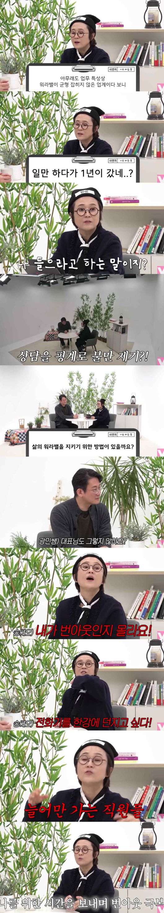 이날 한 직원은 "업무 특성상 워라밸이 쉽지 않은 업계라 삶의 중심이 늘 일에 맞춰져 있다"며 "특히 지난해 연말부터는 '일만 하다가 1년이 갔네?', '이렇게 일만 하다 늙어 죽겠다'는 생각이 들었다"고 털어놨다. 이를 듣던 CEO 송은이는 "나 들으라고 한 소리냐"며 재치 있게 받아쳐 현장을 웃음바다로 만들었다.