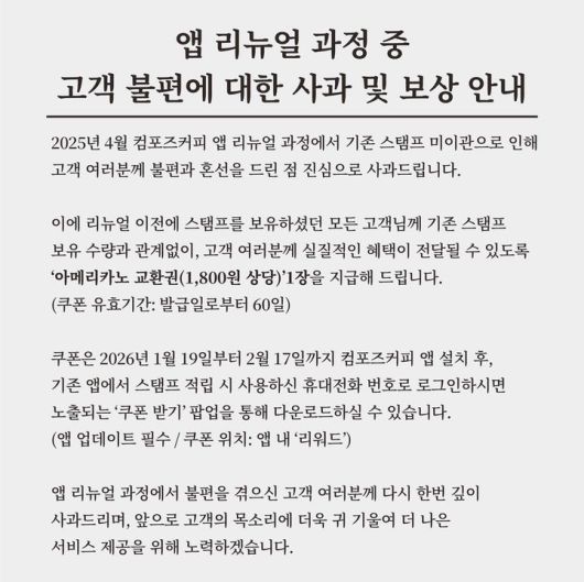 컴포즈커피 측은 "고객에게 실질적인 혜택이 전달될 수 있는 보상 방안을 마련하는 과정에서 시스템 점검과 운영 검토가 필요했다"며 "그로 인해 보상 안내까지 다소 시간이 소요됐다"며 유감의 뜻을 밝혔다.