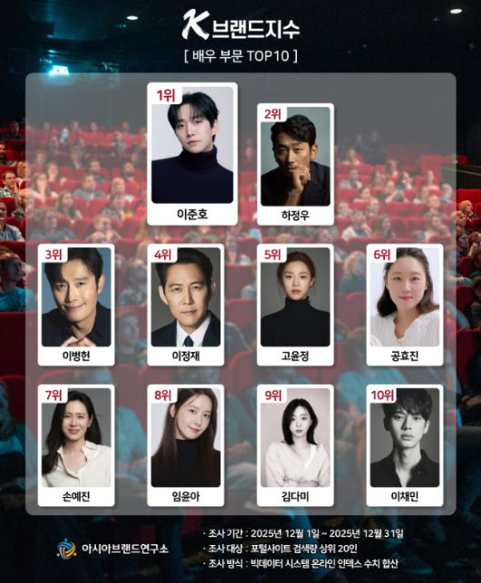 (더쎈뉴스 / The CEN News 정성훈 기자) 아시아브랜드연구소가 16일 발표한 2025년 12월 K-브랜드지수 배우 부문에서 이준호가 1위의 자리에 올랐다.