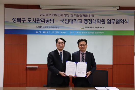 성북구도시관리공단(이사장 박근종)은 지난 1월 15일 국민대학교 행정대학원(원장 하현상)과 공단 임직원의 직무 전문성과 정책 대응 역량 강화를 위해 업무협약(MOU)을 체결하고 공공부문 전문인재 양성을 위한 협력 체계를 본격 구축한다고 밝혔다.
