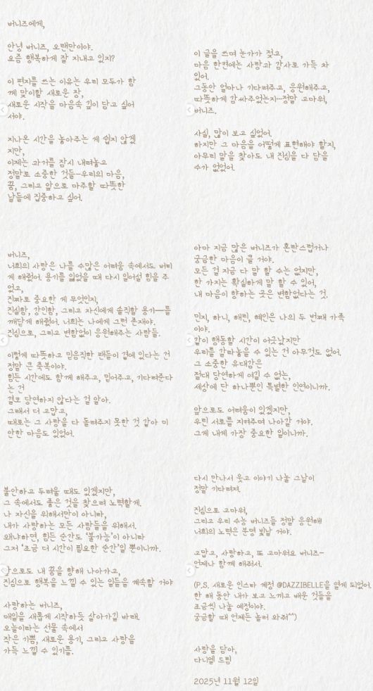 다니엘은 16일 자신의 개인 계정을 통해 "이 편지를 쓰는 이유는 우리 모두가 함께 맞이할 새로운 장, 새로운 시작을 마음속 깊이 담고 싶어서"라며 팬들에게 보내는 장문의 편지를 게재했다.
