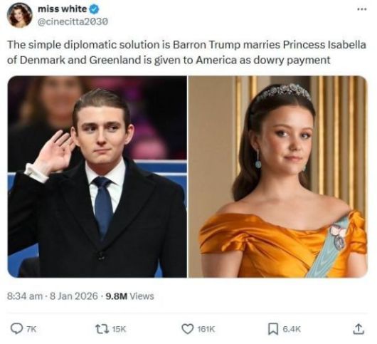 15일(현지시간) USA투데이를 비롯한 외신은 사회관계망서비스(SNS)에서 활동하는 유명 정치풍자 계정 '미스 화이트(Miss White)'가 최근 그린란드를 둘러싼 미국과 덴마크 갈등을 풀 간단한 외교적 해법으로 배런 트럼프와 이사벨라 공주의 혼인을 제안해 논란이 일고 있다고 보도했다. 앞서 해당 계정은 지난 8일 게시글을 통해 "배런 트럼프와 이사벨라 공주가 결혼하고, 그린란드를 미국에 혼수로 주면 될 일"이라고 적었다. 게시물은 빠르게 확산하며 7000개가 넘는 댓글이 달렸다. 배런은 트럼프 대통령이 세 번째 부인 멜라니아 여사와의 사이에서 낳은 막내아들이며, 이사벨라 공주는 덴마크 프레데릭 10세 국왕의 장녀로 왕위 계승 서열 2위다.