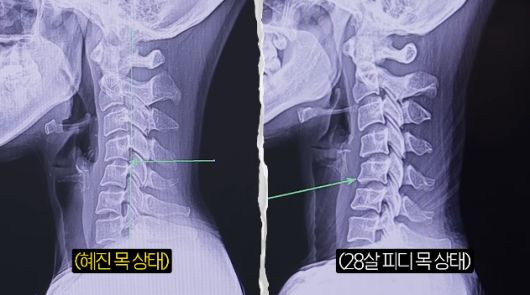 그 뒤 엑스레이 촬영을 했고, 결과물을 본 의사는 "통증이 계속 재발할수밖에 없는게 목이 역커브다"라고 심각한 상태를 지적했다. 한혜진은 "얼굴쪽으로 C자 커브가 있어야하는데 일자다 못해 뒤로 약간 가고있는것 같다"라고 놀랐고, 의사도 "역 C자다"라고 짚었다.