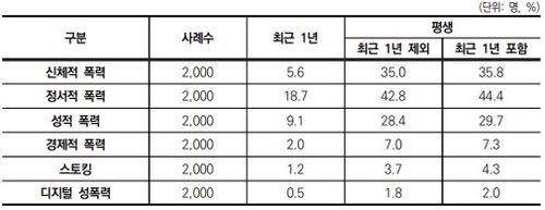 평생을 기준으로 하면 정서적 폭력 44.4%, 신체적 폭력 35.8%, 성적 폭력 29.7%, 스토킹 4.3%, 디지털 성폭력 2.0%로 나타났다.