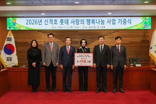 롯데삼동복지재단은 15일 울주군청 이화홀에서 ‘2026년 신격호 롯데 사랑의 행복나눔 사업 기증식’을 열고 울산 지역 소외이웃을 위한 생활필수품을 지원했다고 16일 밝혔다.