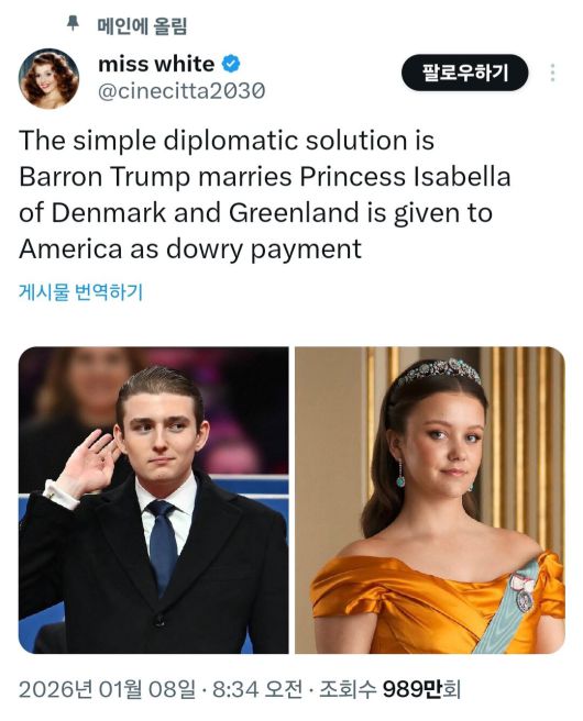 이 계정은 지난 8일 올린 게시글을 통해 “간단한 외교적 해결책은 배런 트럼프와 이사벨라 공주가 결혼하고 그린란드를 미국에 혼수로 주면 될 일”이라고 주장했다.