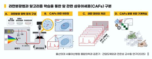 서울아산병원 융합의학과 김준기 교수, 간담도췌외과 전은성 교수, 융합의학과 조민주 박사수료생·고은영 연구원은 췌장암 미세환경을 구성하는 정상 세포인 성상세포와 이로부터 분화시킨 염증성 섬유아세포, 근섬유모세포를 대상으로 형광 표지나 염색 없이 라만 분광 현미경과 인공지능(AI) 기반 판별 알고리즘을 이용해 각 세포 아형이 가진 성분을 정량적으로 분석했다.