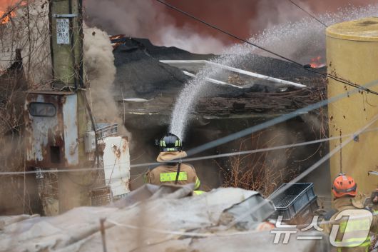 (서울=뉴스1) 김진환 기자 = 16일 오전 서울 강남구 개포동 구룡마을에서 불이 나 소방대원들이 진화작업을 벌이고 있다. 2026.1.16/뉴스1kwangshinQQ@news1.krCopyright ⓒ 뉴스1. All rights reserved. 무단 전재 및 재배포, AI학습 이용 금지.