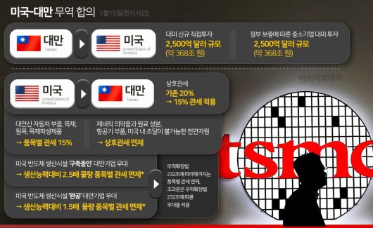 이에 대한 대가로 미국은 대만산 수입품에 대한 관세를 기존 20%에서 15%로 인하하고 TSMC처럼 미국 내 투자를 확대하는 대만 반도체 기업에 대해서는 관세를 면제하기로 했다.