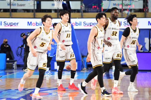 남자프로농구 디펜딩 챔피언 LG가 2025~2026시즌 전반기 1위를 기록했다. LG 선수단이 지난 12일 대구 체육관에서 열린 한국가스공사전을 마친 뒤 도열하고 있다. 사진=KBL 제공 |