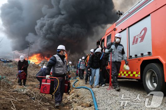 (서울=뉴스1) 김진환 기자 = 16일 오전 서울 강남구 개포동 구룡마을에서 발생한 화재로 불길이 치솟고 있다. 2026.1.16/뉴스1