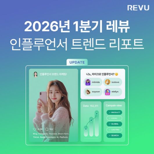 [이데일리 이윤정 기자] 글로벌 인플루언서 플랫폼 기업 레뷰코퍼레이션(이하 레뷰)가 2026년 1분기 인플루언서 마케팅의 핵심 흐름을 데이터로 분석한 트렌드 리포트를 공개했다. 이번 리포트는 레뷰의 축적된 데이터를 바탕으로, 급변하는 콘텐츠 생태계에서 브랜드와 마케터가 주목해야 할 실질적인 인사이트를 담고 있다.