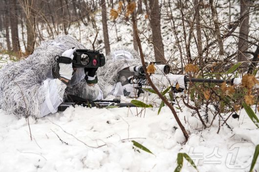 (서울=뉴스1) = 해병대 특수수색여단은 지난 2일부터 2월 26일까지 강원 평창군 황병산 일대에서 2026년 동계 설한지 훈련’을 진행한다고 16일 밝혔다. 사진은 지난 15일 해병대 특수수색여단 장병들이 다기능 관측경을 활용하여 저격 임무를 수행하고 있는 모습. (해병대 제공. 재판매 및 DB 금지) 2026.1.16/뉴스1