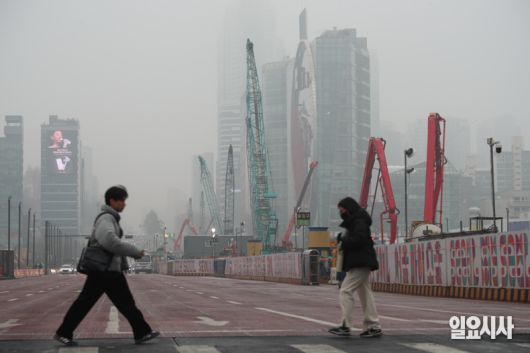 미세먼지가 기승을 부린 16일 오전 서울 강남구 삼성역교차로 일대에서 마스크를 쓴 시민들이 출근길을 서두르고 있다.