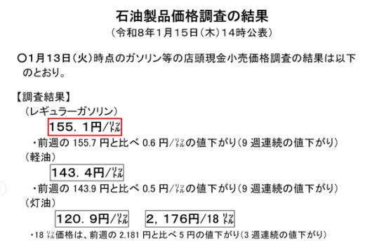 일본 석유정보센터(石油情報センター)에 따르면 레귤러 휘발유 소매가격은 지난 1월 13일 기준 전국 평균 리터당 155.1엔으로 집계됐다. 전주보다 0.6엔 하락한 수치로 9주 연속 내림세를 이어갔으며 2021년 6월 이후 약 4년 7개월 만의 낮은 수준이다. NHK는 미국이 베네수엘라산 원유 공급 확대 가능성을 시사하면서 공급 확대 기대가 거론된 점이 하락 배경으로 언급됐다고 전했다. 다만 석유정보센터는 이란을 둘러싼 중동 정세 긴장으로 뉴욕 원유 선물가격이 반등하고 있어 다음 주에는 하락세가 멈추거나 되돌릴 가능성이 있다고 전망했다.