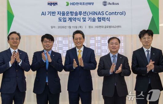 HMM과 HD현대는 지난 15일 경기 판교 HD현대 글로벌R&D센터(GRC)에서 대형 선박용 자율운항 설루션 '하이나스 컨트롤' 공급 계약을 체결했다고 16일 밝혔다. 체결식에는 최원혁 HMM 대표, 김형관 HD한국조선해양 대표, 강재호·임도형 아비커스 대표가 참석했다.