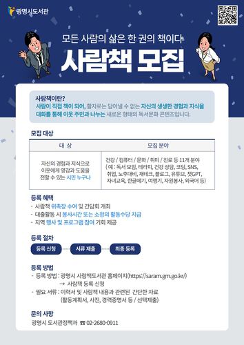 사람책으로 활동을 희망하는 시민은 광명시 사람책도서관 누리집(saram.gm.go.kr)의 '사람책 등록' 게시판에서 신청하면 되며, 이웃을 추천하고 싶은 시민은 누리집 내 '커뮤니티-질문과 답변' 게시판을 통해 참여할 수 있다.