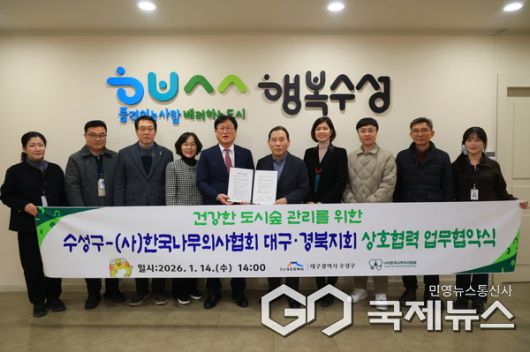 이에 수성구청에 따르면, "(사)한국나무의사협회 대구경북지회(회장 양헌석)는 지난 14일 공원녹지 및 도시숲을 건강하게 관리하기 위한 상호 협력 업무협약을 체결했다."고 전했다.