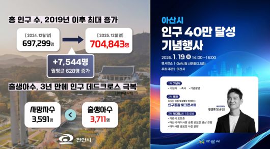 시는 ‘40만명 돌파’를 기념해 19일 오후 2시 아산시청 시민홀에서 시민들과 함께하는 기념행사를 개최한다. 인구 위기에 처한 우리 사회의 인식 개선을 위해 5남매 다둥이 아빠로 잘 알려진 개그맨 정성호를 초청해 다섯 남매를 키우며 알게 된 가족의 가치를 주제로 하는 인구공감 토크콘서트도 진행한다.