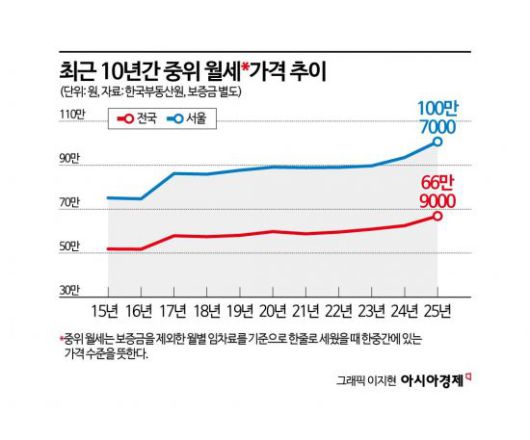 지난달 서울에 있는 주택의 중위 월세가격이 100만원을 넘어섰다. 고가 월세의 심리적 기준선이었던 '100만원'이 선호도가 높은 특정 지역이나 신축 아파트에만 국한한 것이 아니라 주변에서 흔히 볼 수 있게 됐다는 얘기다.