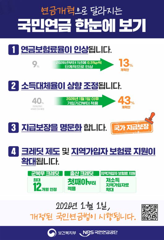 새해부터 달라지는 국민연금의 자세한 내용은 공단 홈페이지, 블로그, 유튜브 채널, 국민연금 On-Air의 연금개혁 페이지에서 확인할 수 있다.