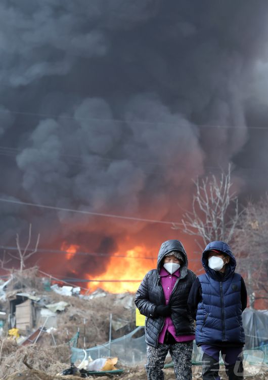 (서울=뉴스1) 김진환 기자 = 16일 오전 서울 강남구 개포동 구룡마을에서 화재가 발생, 주민들이 불길을 뒤로 발걸음을 옮기고 있다. 2026.1.16/뉴스1pjh2035@news1.krCopyright ⓒ 뉴스1. All rights reserved. 무단 전재 및 재배포, AI학습 이용 금지.
