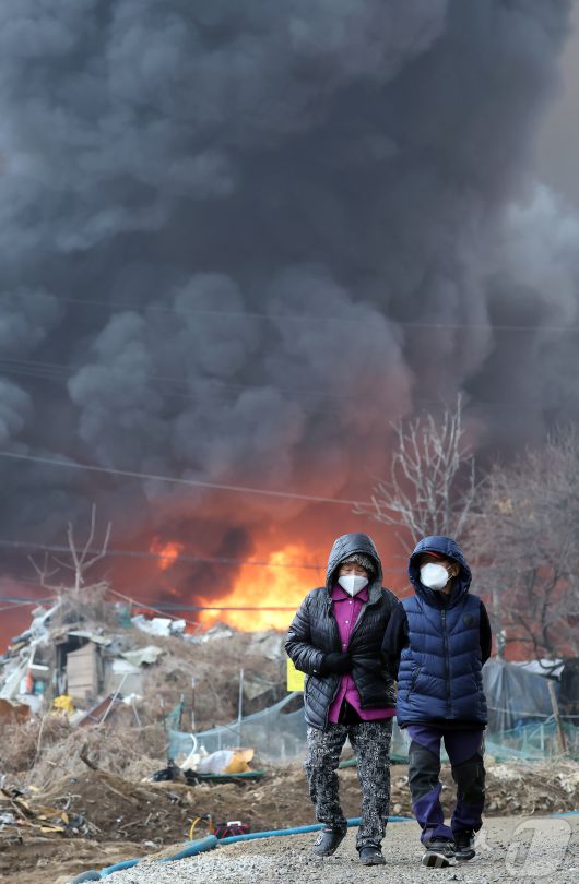 (서울=뉴스1) 김진환 기자 = 16일 오전 서울 강남구 개포동 구룡마을에서 화재가 발생, 주민들이 불길을 뒤로 발걸음을 옮기고 있다. 2026.1.16/뉴스1