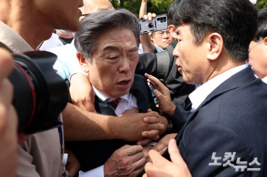 김형석 독립기념관장이 지난해 9월 8일 서울 여의도 국회 소통관에서 기자회견을 마친 뒤 시민단체 회원들의 항의를 받으며 나서고 있다. 윤창원 기자 |