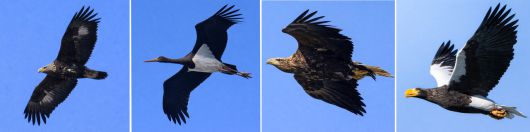 천연기념물이자 멸종위기야생생물Ⅰ급인 검독수리, 먹황새, 흰꼬리수리, 참수리(왼쪽부터)가 겨울나기를 위해 울산을 찾은 모습이 새 관찰자의 카메라에 잡혔다. [울산 새(鳥)통신원·짹짹휴게소 제공] |