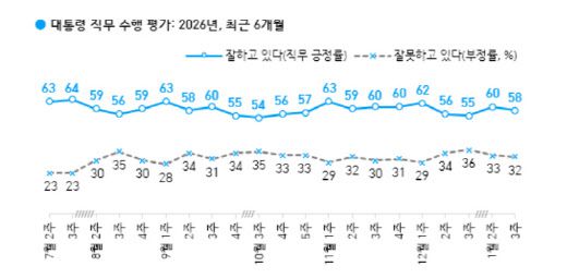 한국갤럽이 지난 13~15일 전국 만 18세 이상 1000명을 대상으로 전화조사원 인터뷰(CATI) 방식으로 조사한 결과, 이 대통령의 국정수행 평가에서 긍정 응답은 58%로 집계됐다. 부정 응답은 32%였다. 10%는 의견을 유보했다. 전주 대비 지지율은 2%포인트 하락했다. 부정 평가는 1%포인트 떨어졌다.