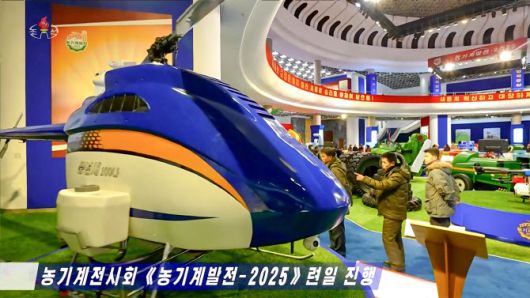 지난해 12월 29일 평양 3대혁명전시관에서 개막된 농기계전시회 ‘농기계발전-2025’ 관련 소식을 조선중앙TV가 지난 9일 보도했다. 참관자들이 전면에 카메라가 장착된 농업용 무인헬기 ‘풍년새 100나’를 관람하고 있다. (사진=연합뉴스) |