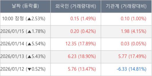 [서울=뉴스핌] 로보뉴스 = 16일 10시 15분 현재 티쓰리(204610)는 전일 대비 2.53% (현재가 1,989원) 상승했고, 외국인이 최근 7일 연속 순매수(누적 28.49만 주, 잠정) 행진을 하고 있다.