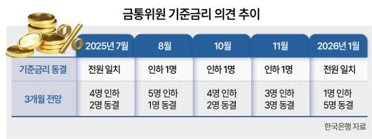 지난 2024년 7월 금통위는 12회 연속 기준금리를 동결하면서도 통방문에 “기준금리 인하 시기 등을 검토”하겠다는 문구를 처음 넣으며 기준금리 인하 신호를 보냈다. 이후 8월 한 차례 더 금리를 동결한 뒤, 10월 0.25%포인트 금리를 낮추면서 본격적인 인하 기조에 돌입했다. 지난해 1월부터는 통방문에 “추가 인하 시기 및 속도 등을 결정하겠다”는 문구를 매번 넣으면서 2월과 5월 두 차례에 걸쳐 총 기준금리를 총 0.5%포인트 내렸다.