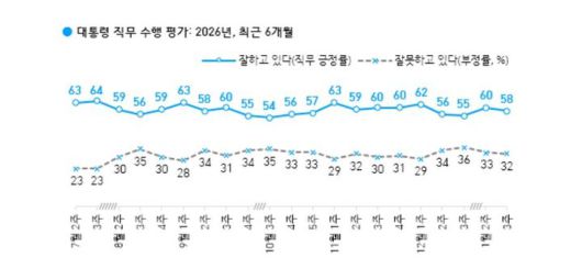 [서울=뉴시스]조재완 기자 = 이재명 대통령의 직무 수행에 대해 '잘하고 있다'는 긍정 평가는 58%, '잘못하고 있다'는 부정 평가가 32%라는 여론조사 결과가 16일 나왔다.