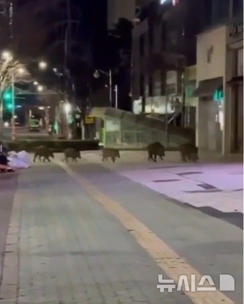 당시 현장에서는 어미로 추정되는 성체 멧돼지 2마리를 따라 새끼 3마리가 도로를 횡단하고 인도를 지그재그로 줄지어 이동하는 모습이 목격됐다.