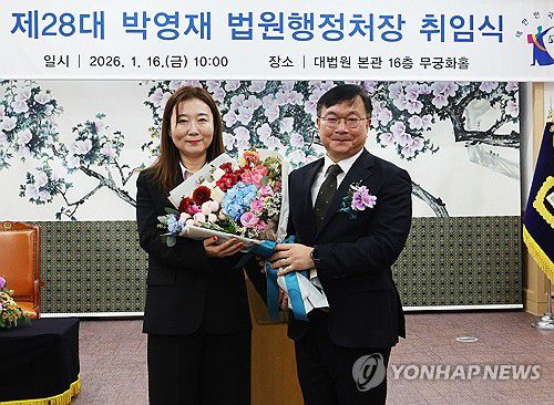 (서울=연합뉴스) 한종찬 기자 = 박영재 신임 법원행정처장이 16일 서울 서초구 대법원에서 열린 취임식에서 꽃다발을 받고 기념촬영을 하고 있다. 2026.1.16